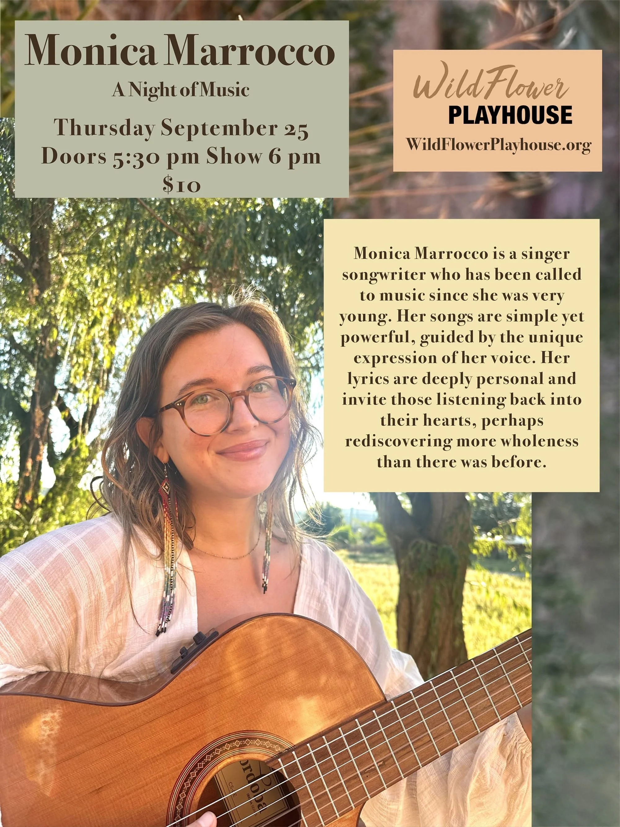 Monica Marrocco is a singer songwriter who has been called to music since she was very young. Her songs are simple yet powerful, guided by the unique and beautiful expression of her voice. Her original songs are inspired by nature and lived experience. Her lyrics are deeply personal and invite those listening into their hearts, perhaps rediscovering more wholeness than there was before. Soft sweet melodies alternate with strong and fierce drum prayers. This is a musical performance straight from the heart.