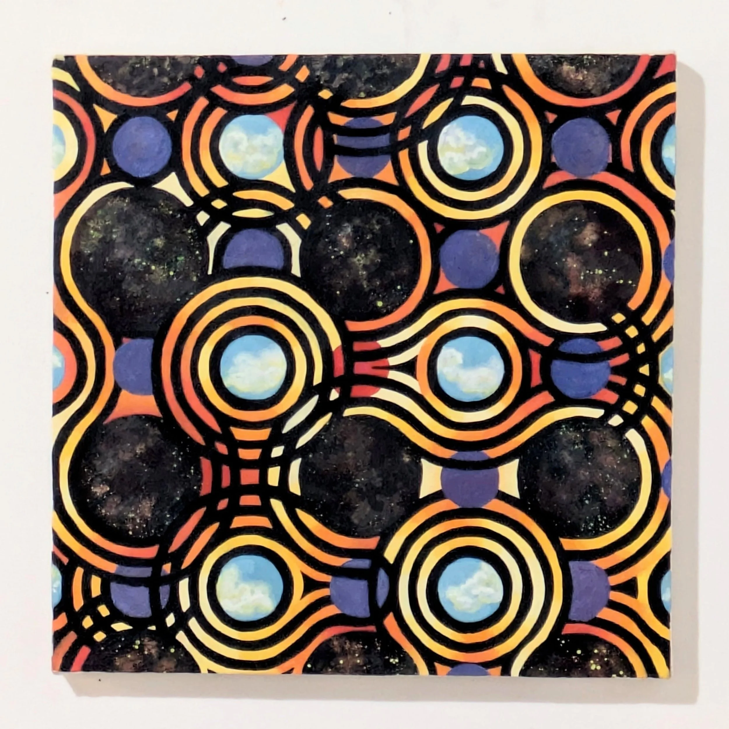 Harper, who is neurodivergent, makes work which appears orderly and meticulous. This betrays the actuality of a life in relative chaos– and a general struggle to adapt to ‘real world’ conditions and meet societal expectations. The main resolve in her art is that with order on the canvas, all will be well. The long hours spent on repetitive pattern making are actually a meditative process which quiets the mind and gives rest to the otherwise racing thoughts and tormenting internal narratives.