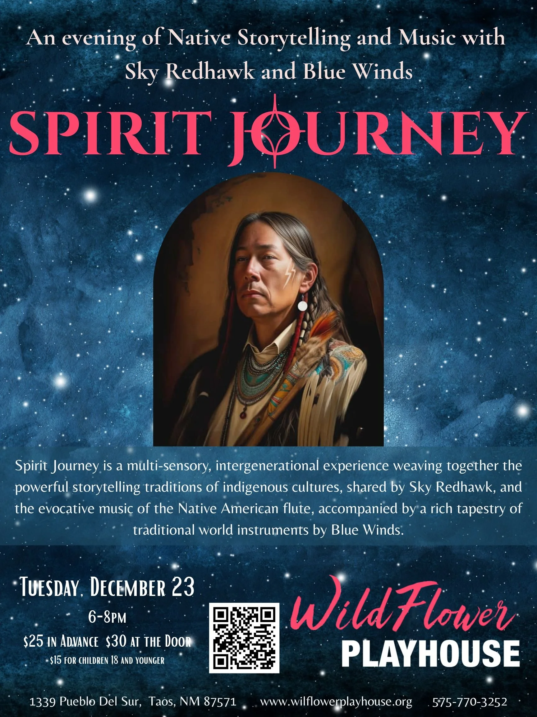 Spirit Journey is a multi-sensory, intergenerational experience weaving together the powerful storytelling traditions of indigenous cultures, shared by Sky Redhawk, and the evocative music of Native American flute, accompanied by a rich tapestry of traditional world instruments by Blue Winds.